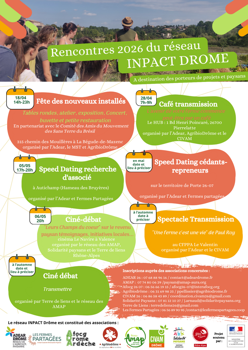 En Drôme, le pôle INPACT 26 travaille essentiellement sur l’installation et la transmission agricole, éléments indispensables pour des campagnes vivantes. Pour cela, nous mettons en place diverses actions :