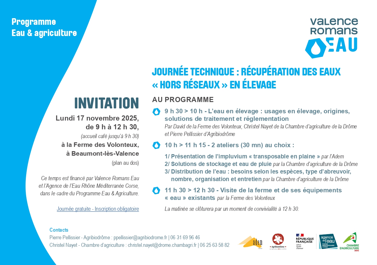 INVITATION – Journée Technique Eau en élevage – 17 Novembre – Beaumont-Lès-Valence 3 Nov 2025 | Actualités réseau, Eau, Élevage, Ressources naturelles Lien vers les inscriptions: CLIQUEZ ICI